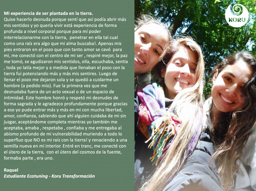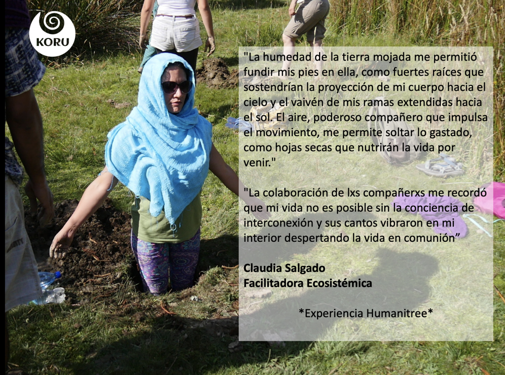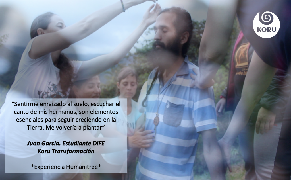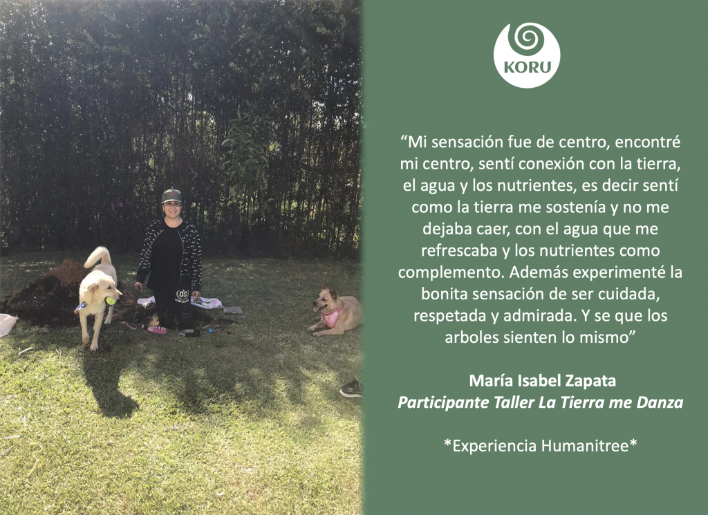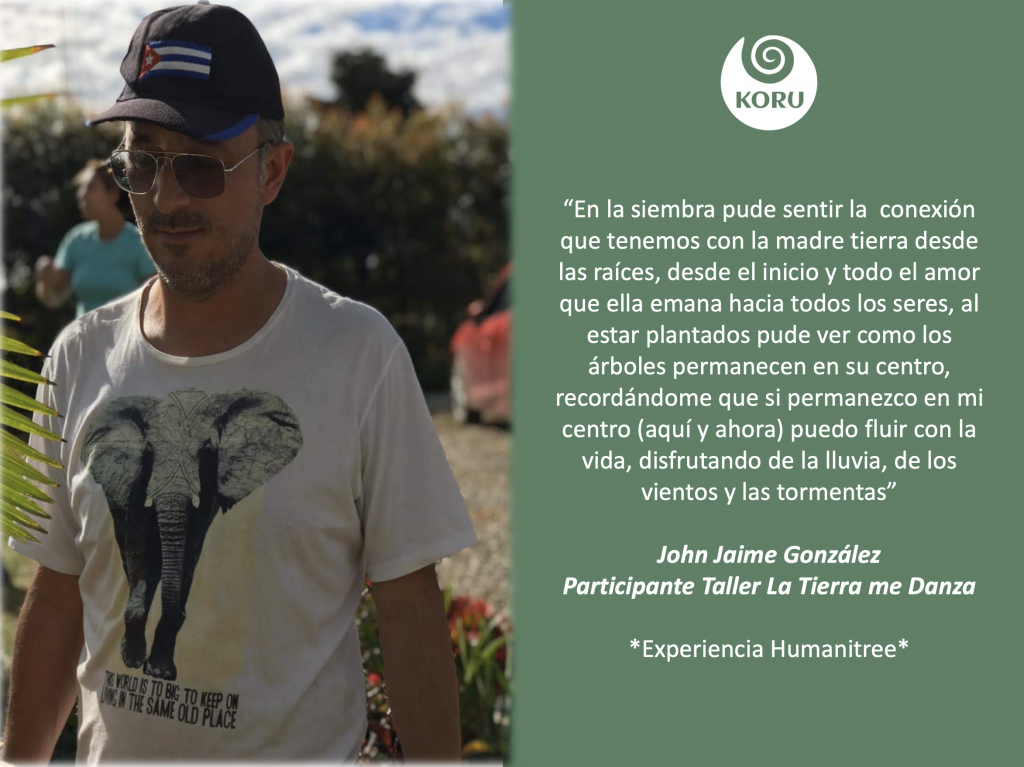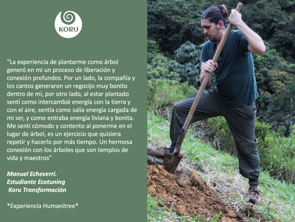 Desde Koru Transformación nos unimos al Movimiento Humanitree, como una forma preciosa y contundente de demostrar nuestro amor a Pachamama y de sanar nuestros egos individualistas. Hemos realizado experiencias en Colombia, Chile y España, siguiendo el proceso recomendado por Humanitree y en el marco de nuestros talleres de Ecopsicología. En donde el objetivo es apoyar el camino del despertar de la Conciencia de Ser Naturaleza, y de esta manera aportar a la regeneración y a la salud planetaria. Entendemos que cuerpo – psique y medioambiente forman una unidad mayor y más evolucionada que se retroalimenta constantemente.