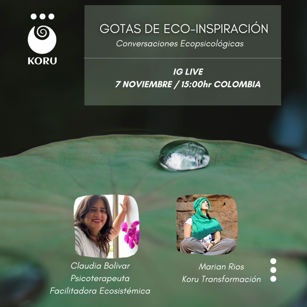 Son conversaciones en línea, gratuitas (a través de nuestro instagram: https://www.instagram.com/koruecopsicologia/) para nuestra comunidad Koru. Cada primer lunes del mes, nos conectamos en torno a la experiencia y la vida de una Ecopsicóloga o un Facilitador Ecosistémico, para abrir el abanico de posibilidades y profundizar en nuestro compromiso con la regeneración.