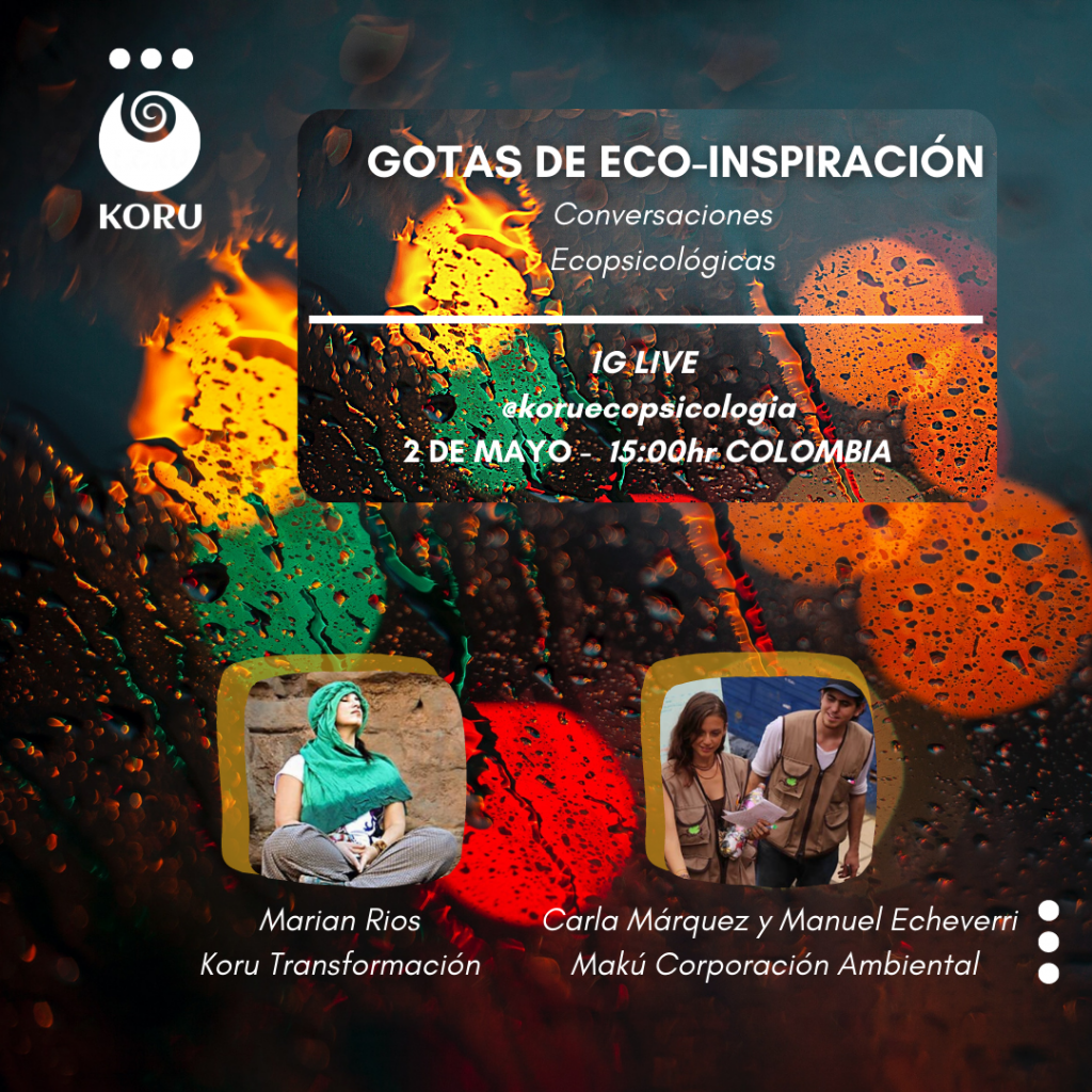 Son conversaciones en línea, gratuitas (a través de nuestro instagram: https://www.instagram.com/koruecopsicologia/) para nuestra comunidad Koru.  Cada primer lunes del mes, nos conectamos en torno a la experiencia y la vida de una Ecopsicóloga o un Facilitador Ecosistémico, para abrir el abanico de posibilidades y profundizar en nuestro compromiso con la regeneración.