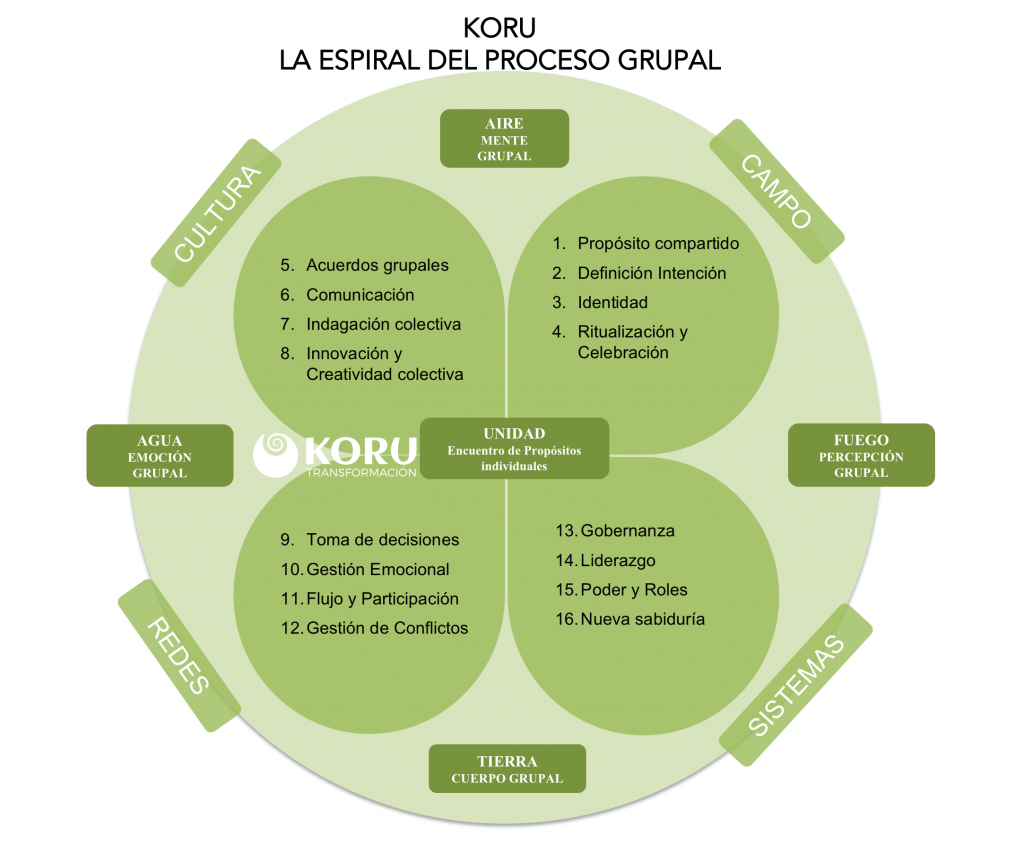 Al activar el elemento Tierra en el movimiento de la espiral trabajamos con la estructura y el Cuerpo Grupal. Exploramos los espacios grupales de evaluación, liderazgo, poder, roles y gobernanza.